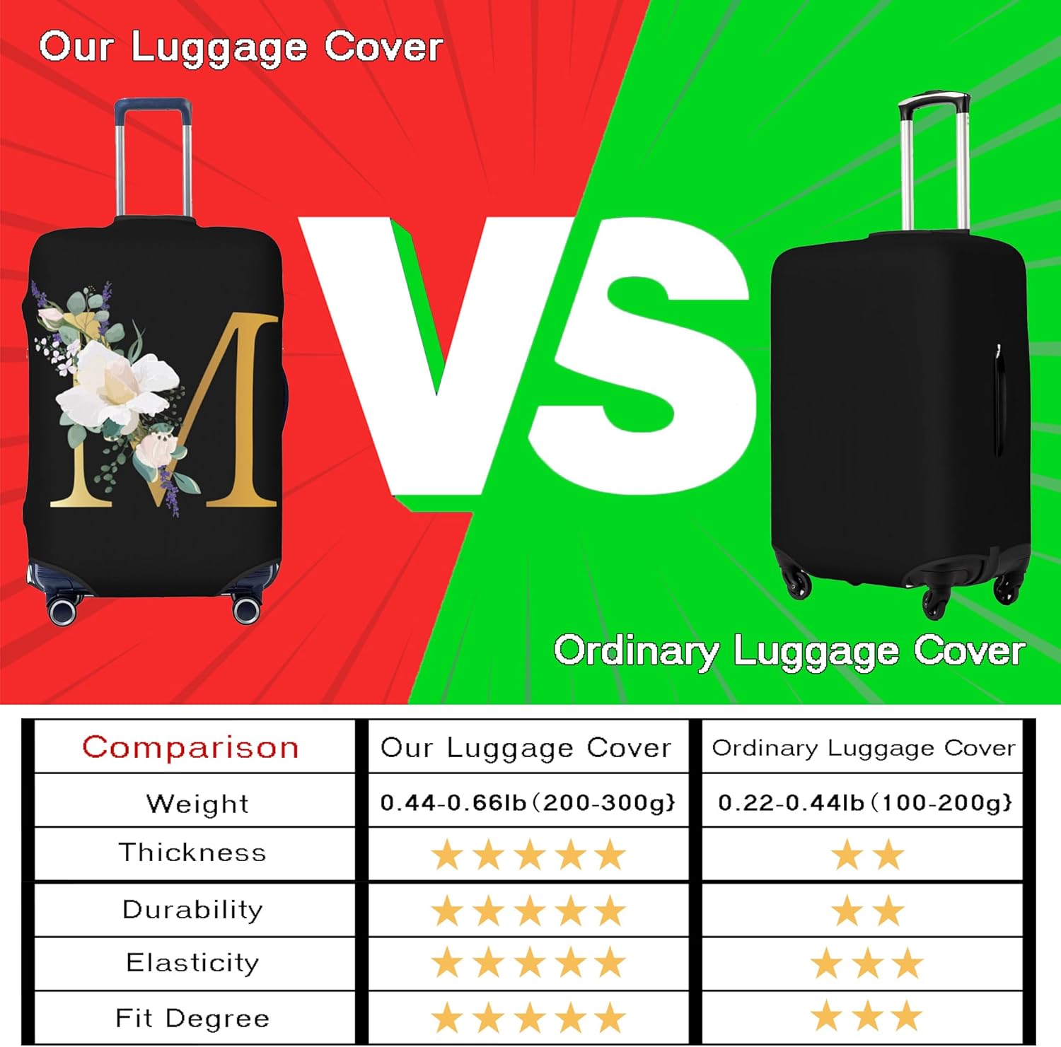 TRAVEL LUGGAGE COVER1. Fits 18-32 inch suitcase.2. Easy to fit and remove.3. Identify your luggage quicker.4. Full of stretch and high elasticity.5. Stay your luggage new-looking6. Not fade after washing.PRODUCT FEATURESStretchy And Washable MaterialPolyester fiber, stretchy and tear-resistant to keep your luggage looks like new.Sides Handle Zipper ClosureBoth sides have zippers to fit left and right handle luggage.Top Openning DesignA big opening for telescoping handle and carrying handle make the cover easy to fit and remove.Bottom Zipper ClosureZipper at the bottom to ensure the luggage get enough covered.Unique And Fashion PatternFashion design and vivid HD digital printing Bring to you Extraordinary visual impact.With the unique pattern will help you easy to find your luggage quickly.4 SIZES AVAILABLE S (18.8-20.8 H) x (12.5-14.2 L) x (7.8-9.4 W) fits 18-21 inch luggage. M (22.8-25 H) x (14.6-16.1 L) x (9.0-10.6 W) fits 22-24 inch luggage. L (26-28 H) x (16.5-18.5 L) x (10.2-11.8 W), fits 25-28 inch luggage. XL (28.3-31.5 H) x (18.9-21.2 L) x (11.4-13 W) fits 29-32 inch luggageHow to measure your luggage size?1.Height measurement (without wheel) 2.When measuring length and height, please open the luggage and measure from the inside. 3.If your luggage is soft shell style,please order a bigger size.Dear Buyer :- How to maintain the Luggage Cover?- Wash it with clean water in ordinary temperature.- DO NOT wash it with hot water and alkaline detergent.- Hang to dry and store in ventilated place instead of sun exposure.-Washing separately to avoid staining.